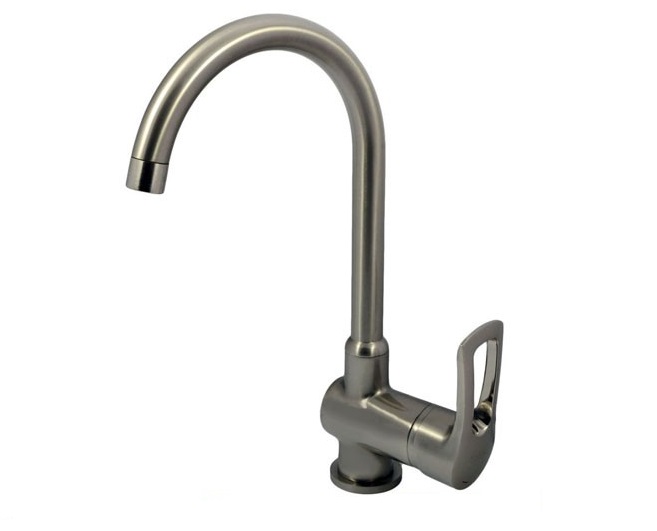 Латунный картриджный смеситель для кухни с эксклюзивным полукруглым поворотным изливом. Гибкая подводка в комплекте.